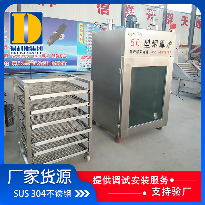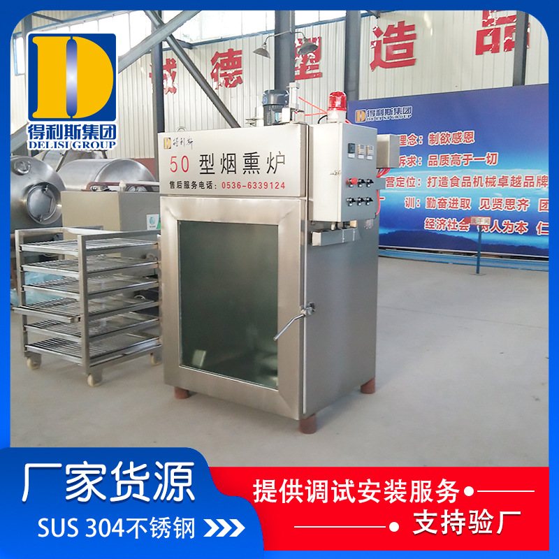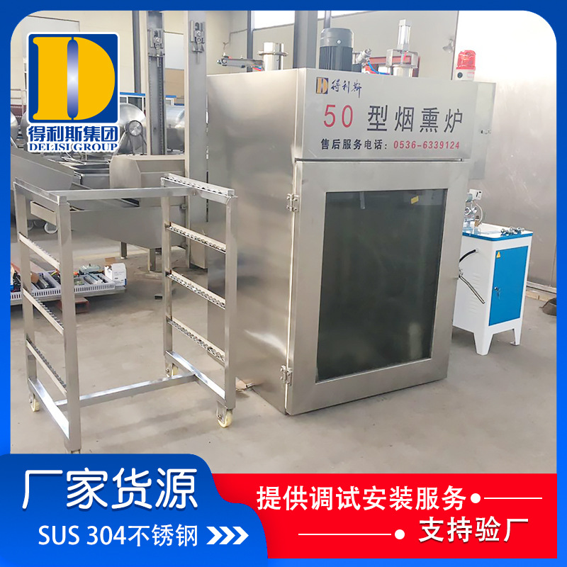 全自動煙熏爐的發(fā)煙系統(tǒng): 外置式木粒、木屑發(fā)煙系統(tǒng),不僅使產(chǎn)品產(chǎn)生果木香氣,而且可以使產(chǎn)品熏成由淺入深的金黃色。外置全自動煙熏爐分體式糖爐發(fā)煙系統(tǒng),可熏制傳統(tǒng)的中式產(chǎn)品,產(chǎn)生糖熏味道,并且顏色可以控制,深可以成為棗紅色。兩種發(fā)煙系統(tǒng)同時使用能產(chǎn)生煙熏香氣和顏色。門上木粒發(fā)煙系統(tǒng),采用世界上先 進的內(nèi)循環(huán)發(fā)煙工藝,低氧狀態(tài)發(fā)煙,縮短煙道長度,降低能耗,減少設(shè)備占地面積。材質(zhì)、保溫 箱體結(jié)構(gòu)以單車為單元,可以拼裝成不同的組合。材質(zhì)采用進口SUS304不銹鋼拉絲扳。保溫層采用進口聚氨酯保溫材料,耐高溫一次成型,保溫性能好。控制元器件 PLC、人機界面、電磁閥等關(guān)鍵元器件采用進口產(chǎn)品。加熱方式 采用外接蒸汽加熱或電加熱方式。配備在線清洗系統(tǒng)。門鎖和門合頁及密封條設(shè)計合理,密封嚴密,操作方便。生熟區(qū)門互鎖,區(qū)域隔離,符合HACCP要求。